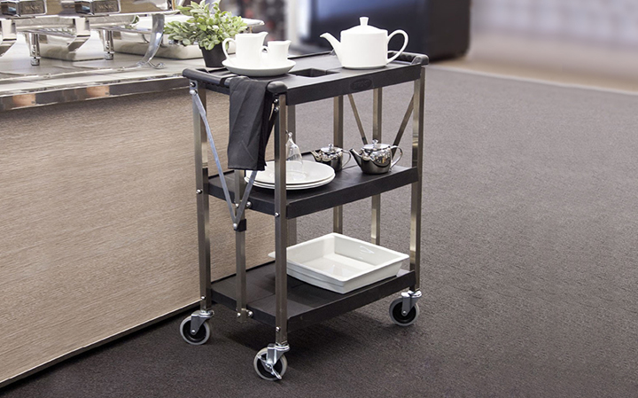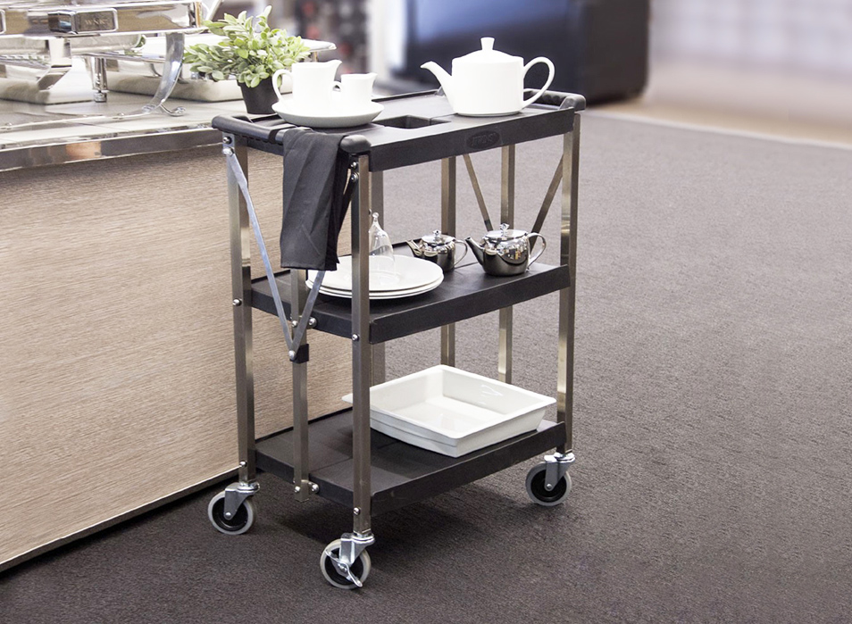 堅厚的不銹鋼材料,車表面帶有磨砂處理,美觀耐用卡扣設(shè)計,可快速、簡單的折疊或展開餐車; 折疊存放可減少50%的面積; 符合人體工學(xué)的把手設(shè)計,操作舒適; 4”萬向靜音輪,其中兩個帶剎;安全,安靜可承重150KG; 廣泛使用于各類餐廳和酒店.